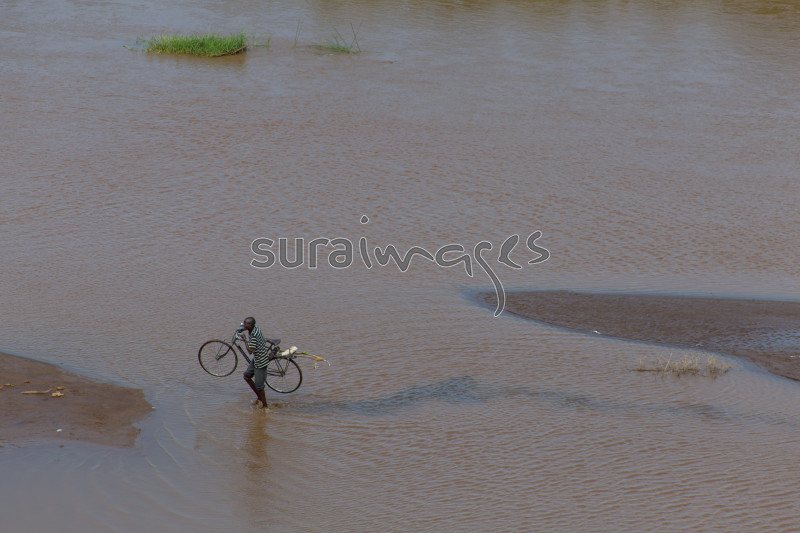 | Title | A mature African male carrying his bicycle as he crosses the lake |