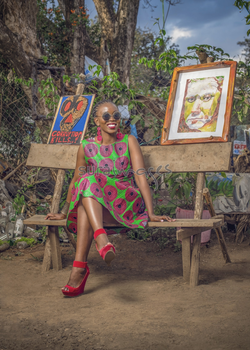 | Title | African girl in Ankara dress seated in a wooden bench |