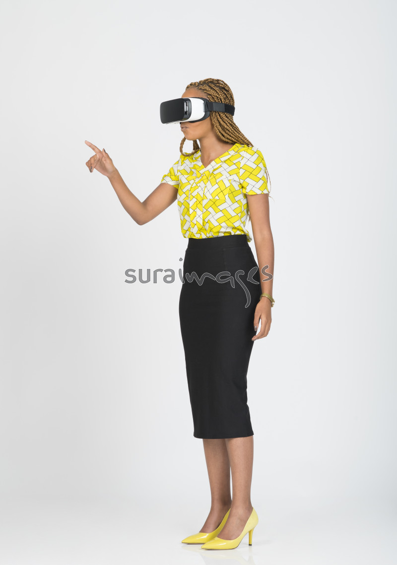 | Title | Excited young businesswoman with VR headset pointing in the air |