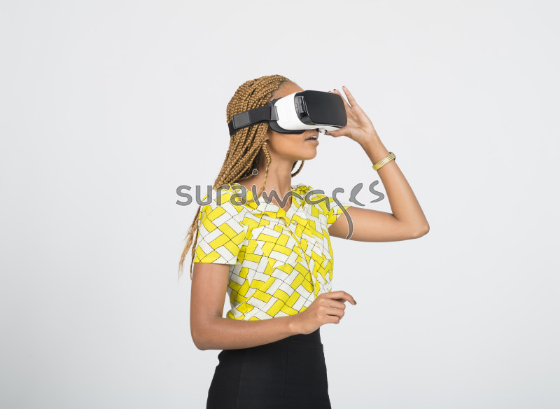 | Title | Young business executive holding VR headset as she enjoys the experience |