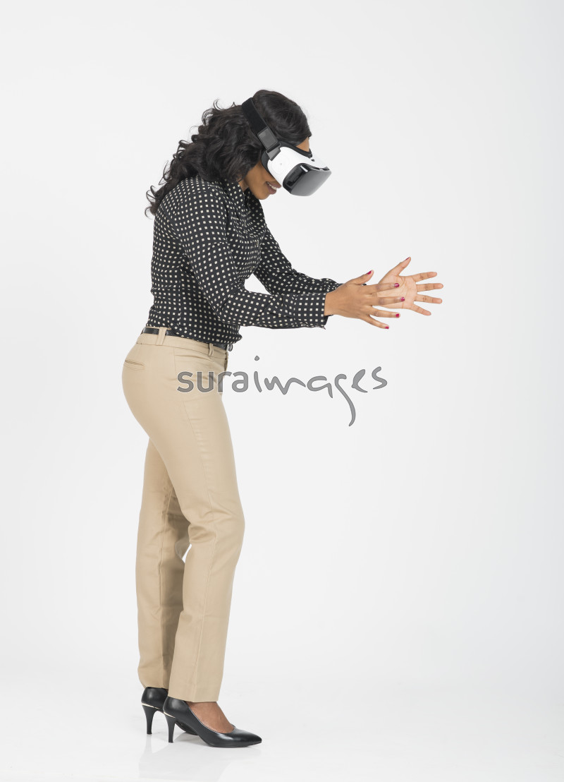 | Title | Young female executive simulating touch using VR experience |