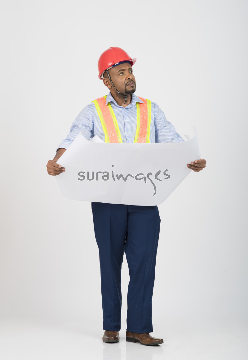 Title Young male engineer reading the building blueprint