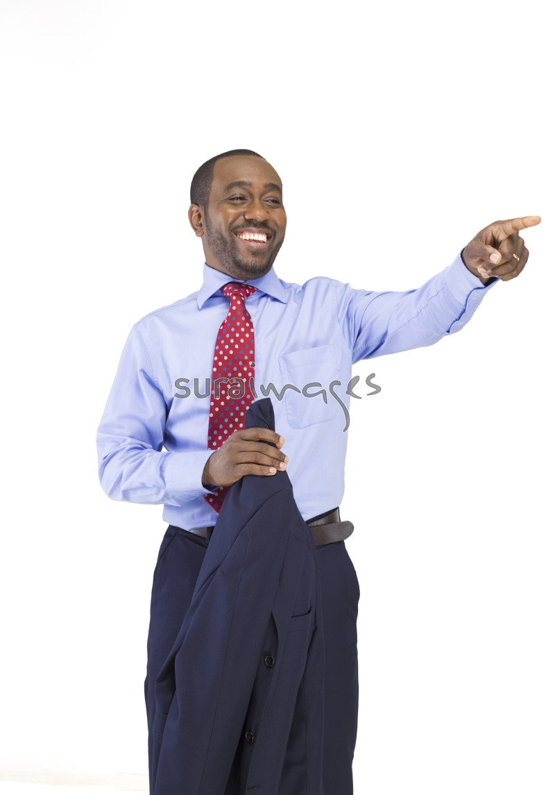 | Title | A happy male business executive isolated in white pointing away |