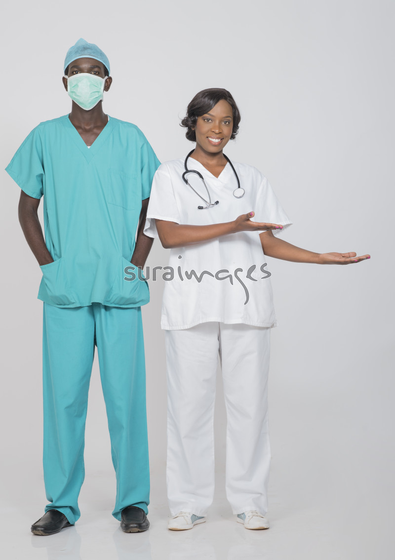 | Title | Male surgeon and female nurse giving a welcome gesture |