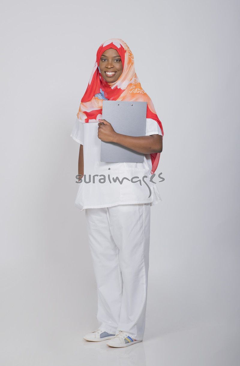 | Title | Female nurse standing on isolated white background |