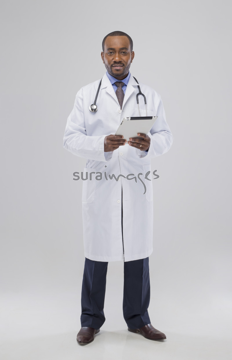 | Title | Male doctor standing on isolated white background while holding a tablet |