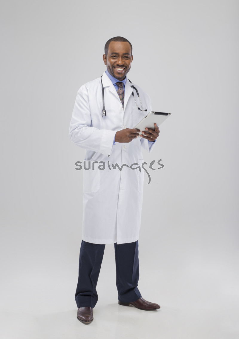 | Title | A happy male doctor standing on isolated white background while holding a tablet |
