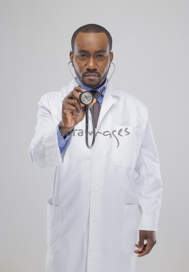 Title A male doctor using his stethoscope