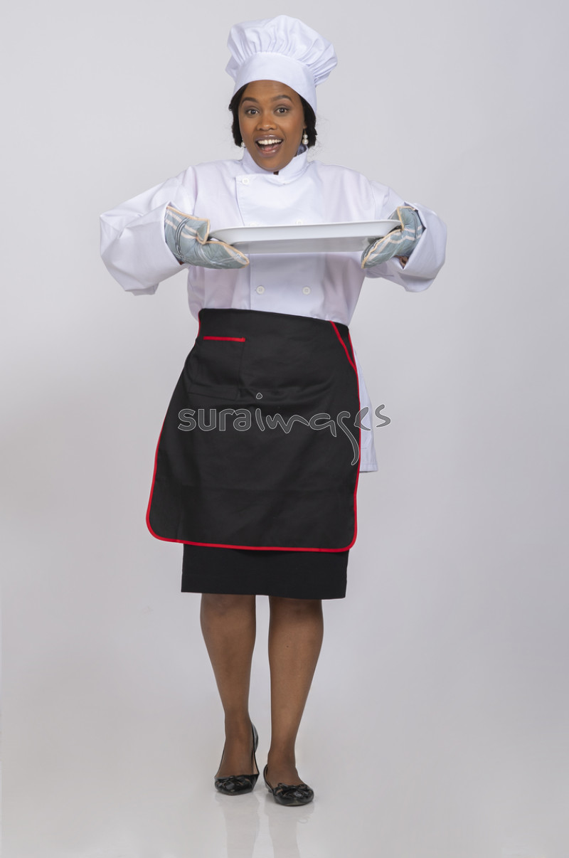 Title An excited female baker holding a tray