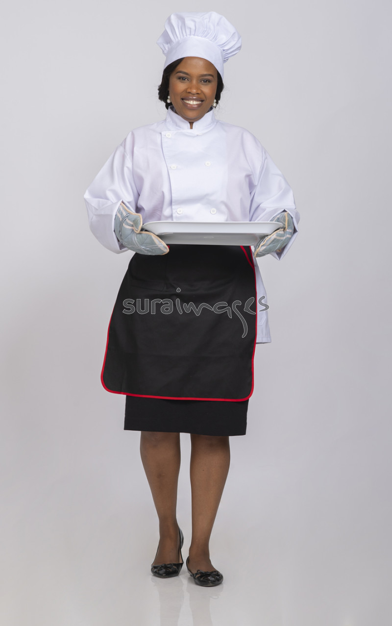 Title An excited female baker holding a tray