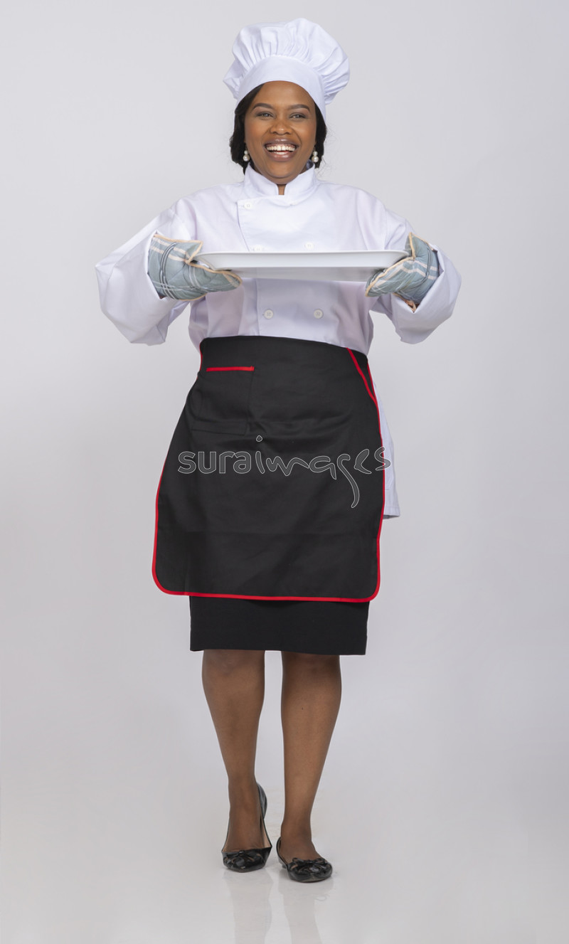 Title An excited female baker holding a tray