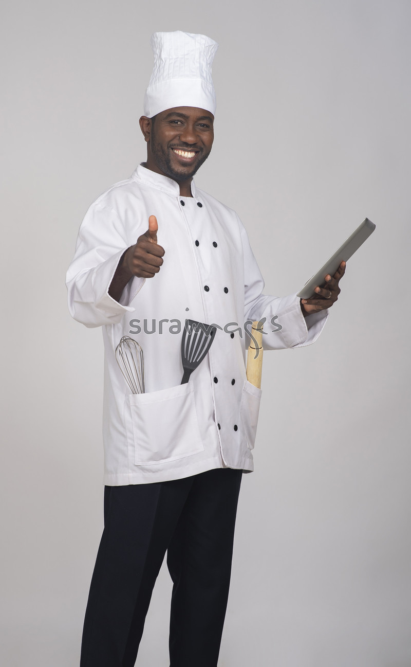 Title Male chef going through a recipe on his tablet
