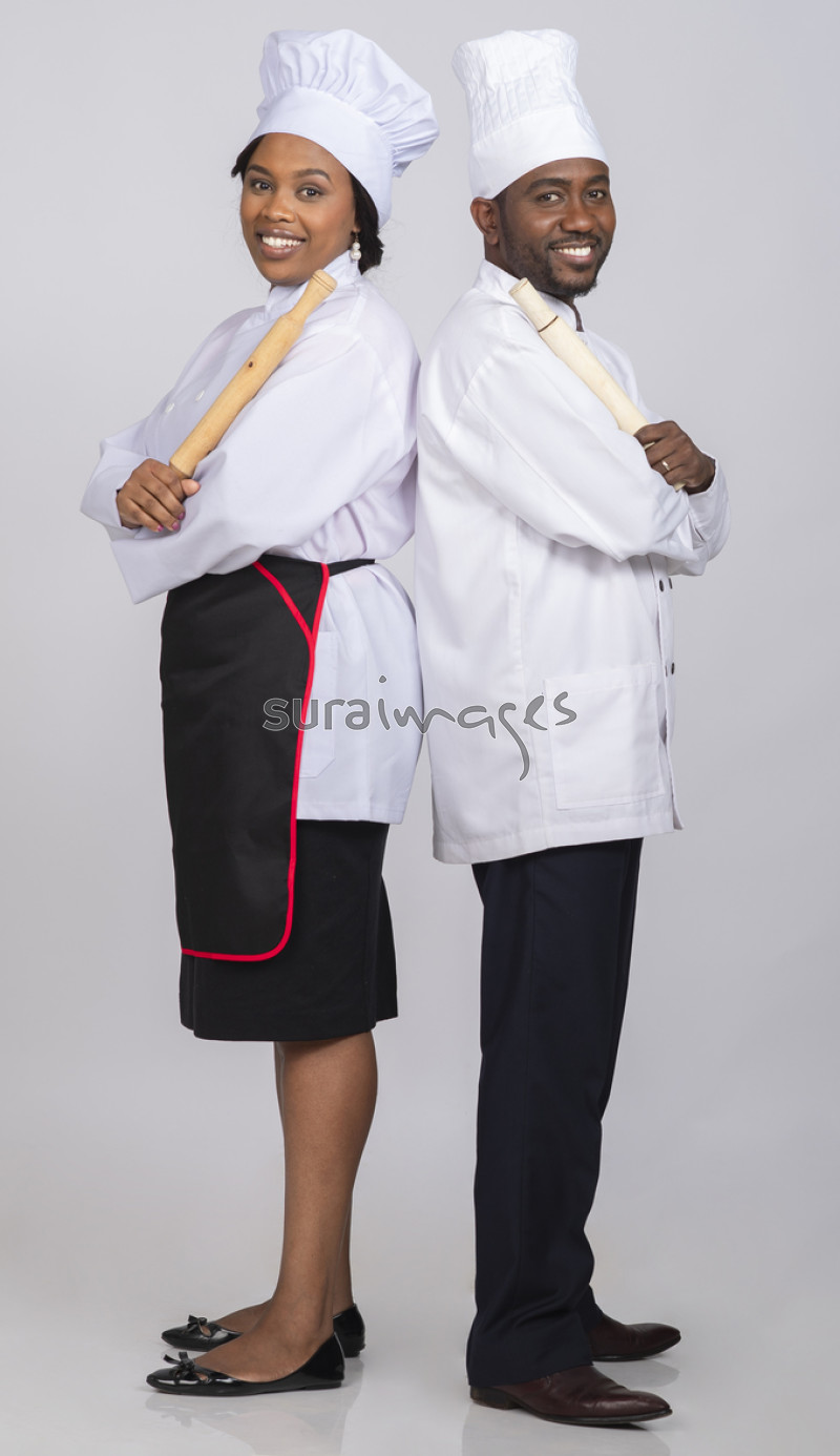 | Title | A male and female chef standing together sharing a meal |