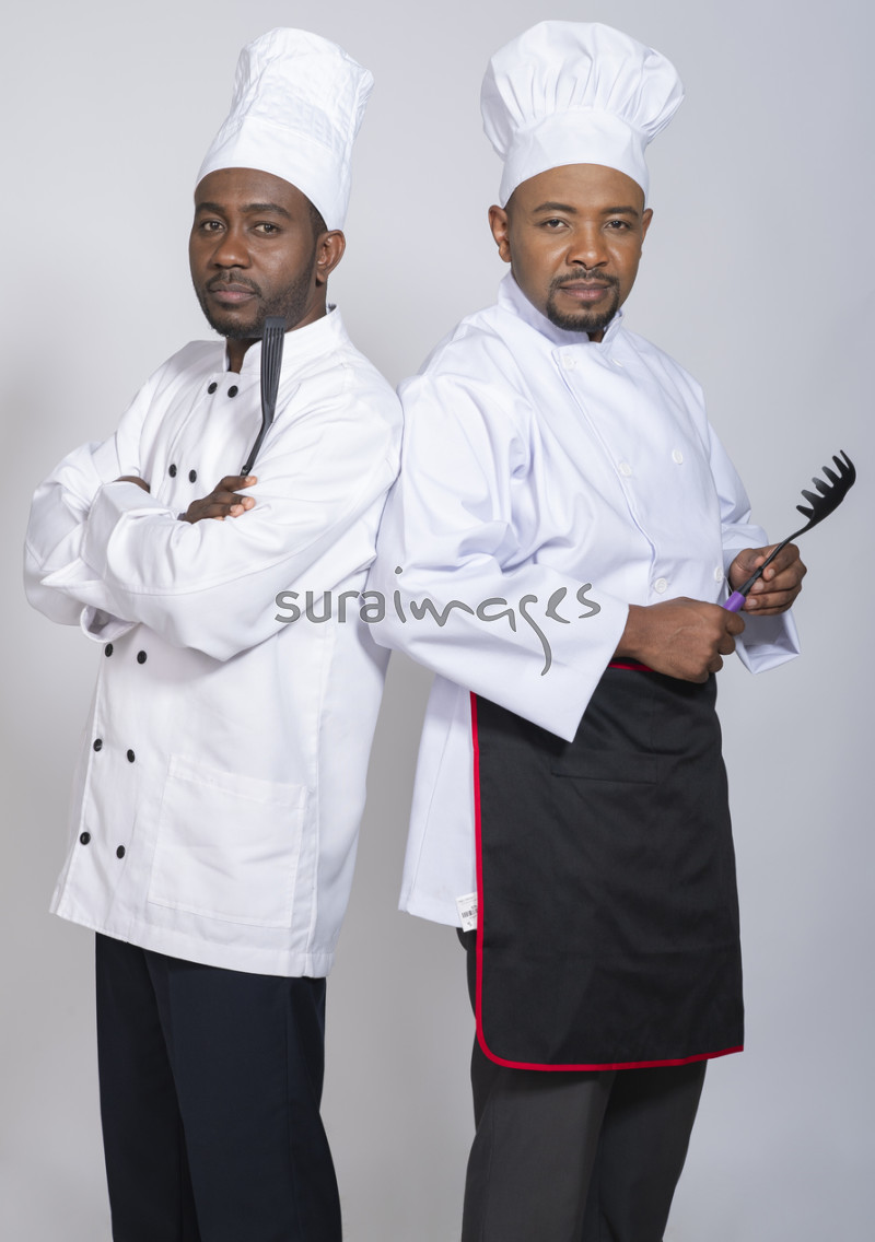Two happy male chefs goofing around