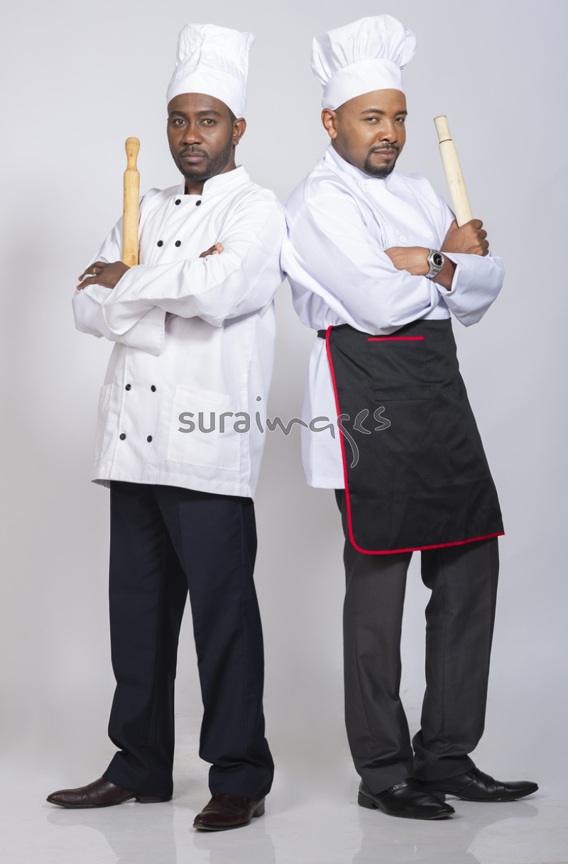 Two happy male chefs goofing around