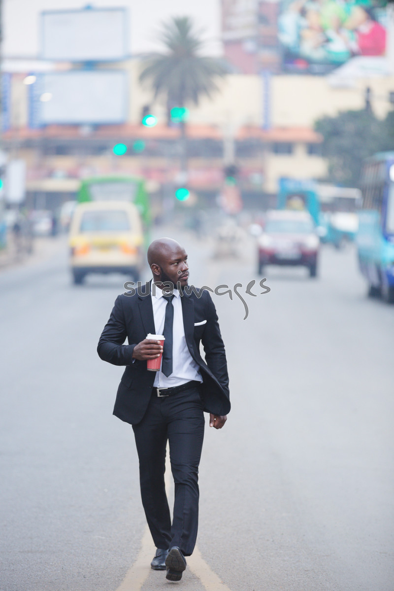 Title Businessman in town holding a coffee cup