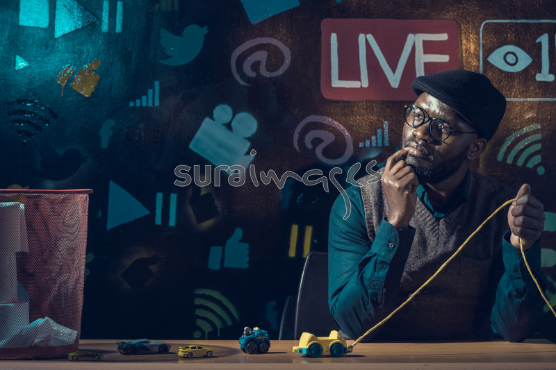 Young lad thinking as he plays with his toys