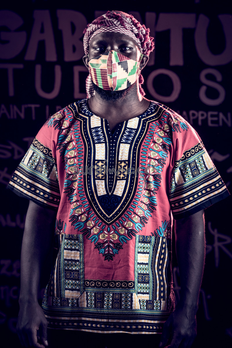 A young male wearing African print shirt and a mask