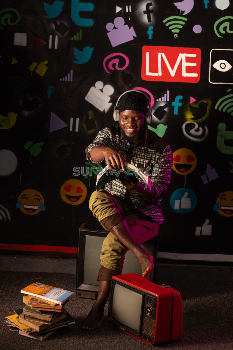 Title Young lad in studio reading and listening to music