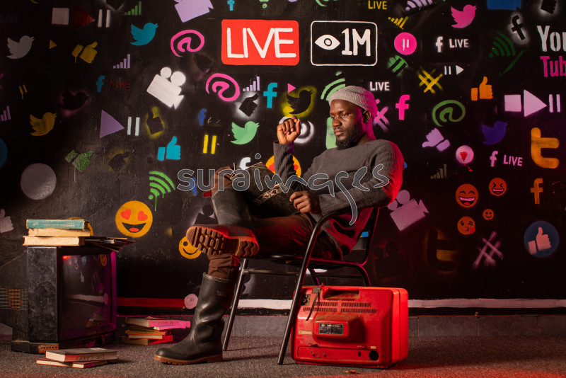 Title Young lad in studio reading and listening to music