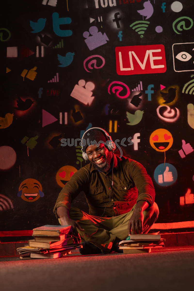 Young lad in studio reading and listening to music
