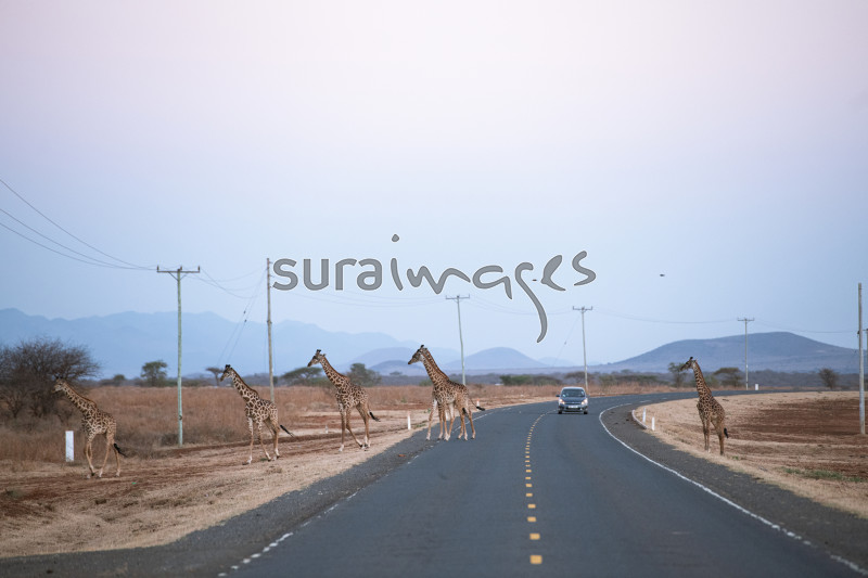 | Title | Giraffe crossing the road in Amboseli national park |