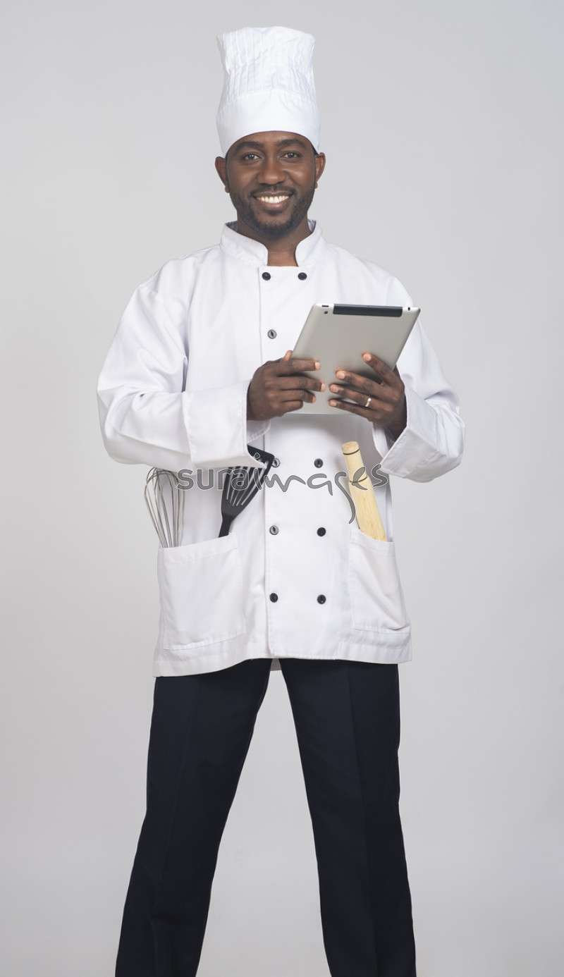 | Title | Male chef going through a recipe on his tablet |