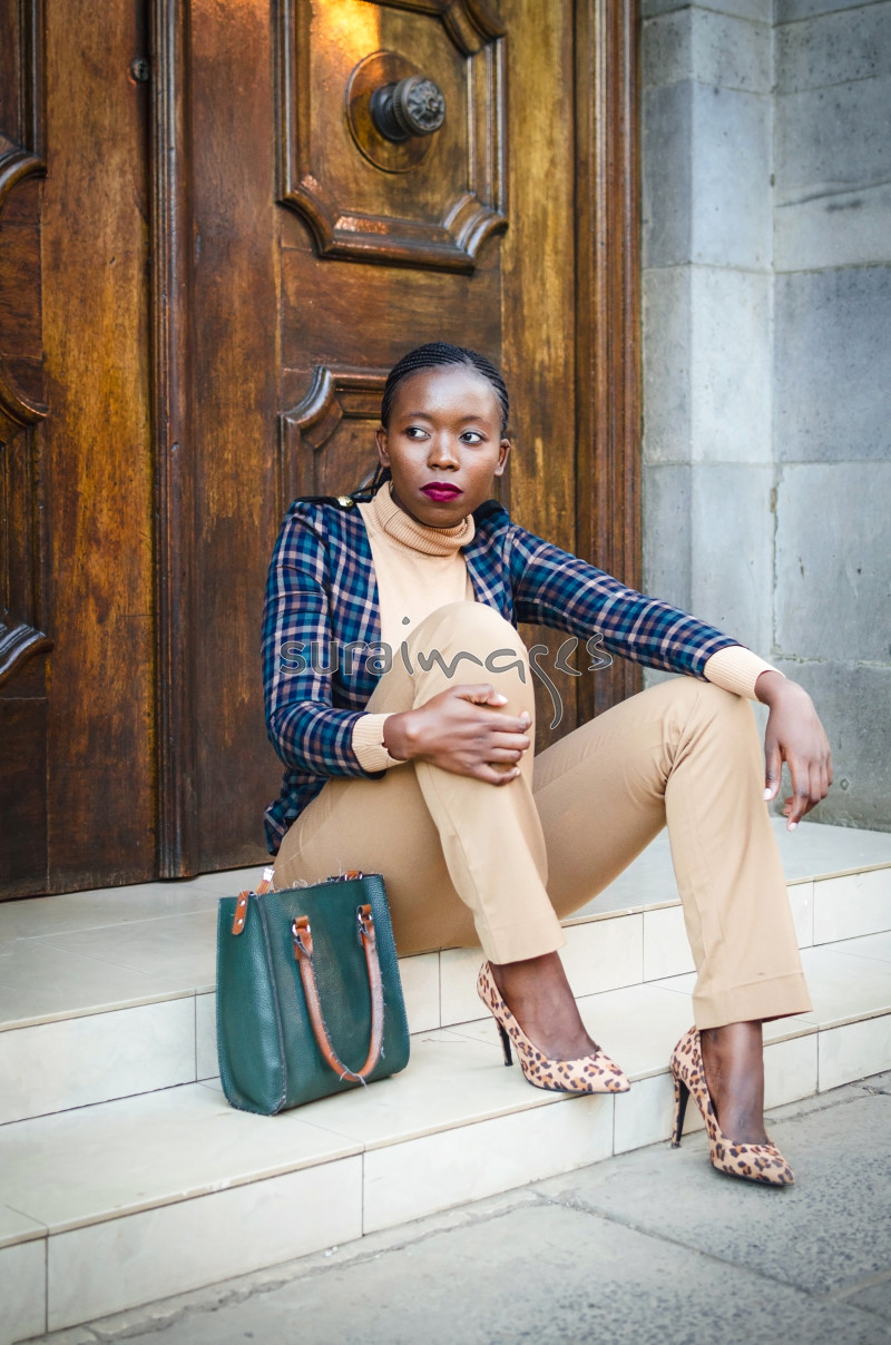 | Title | Young female seated next to a wooden door |