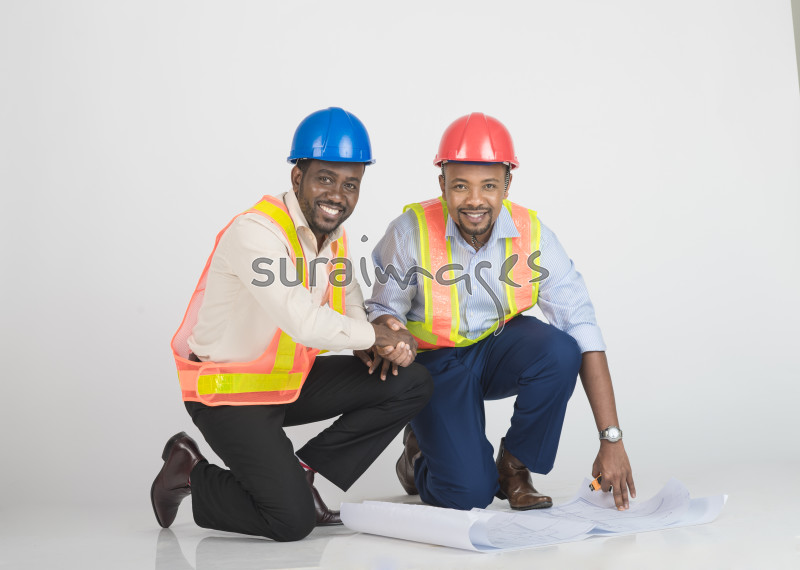 | Title | Two happy young male engineers shaking hands as the inspecting a building |