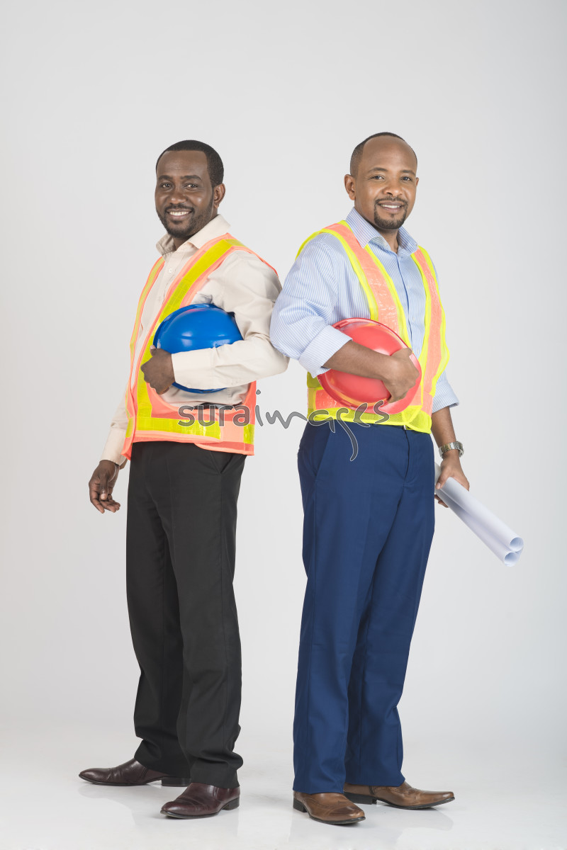 | Title | Two young male engineers striking a pose holding building blueprint |