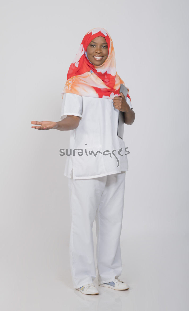 | Title | A female nurse doing a welcome gesture while holding patient file |