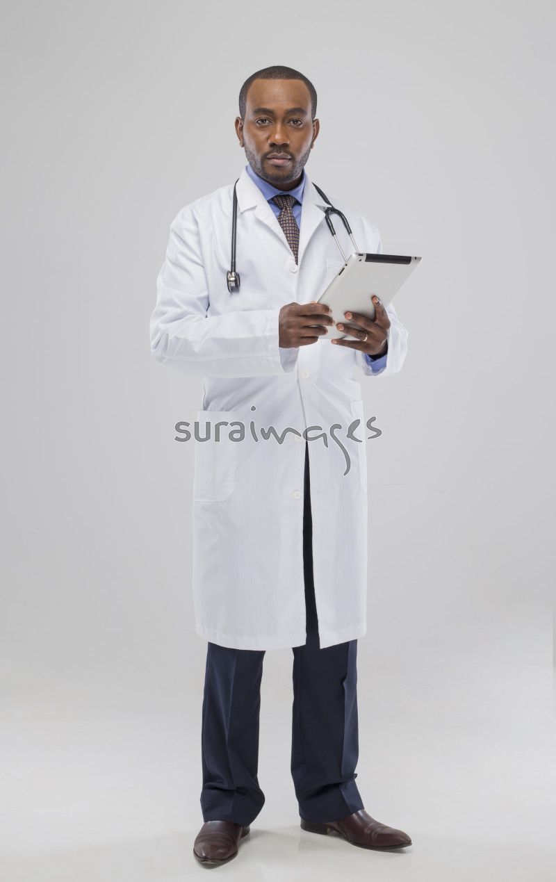 | Title | Male doctor going through patients records on a tablet while standing |