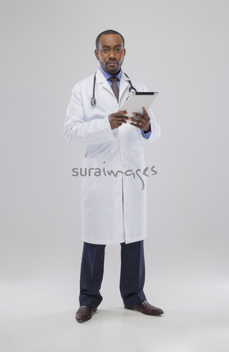 | Title | Male doctor standing on isolated white background while holding a tablet |