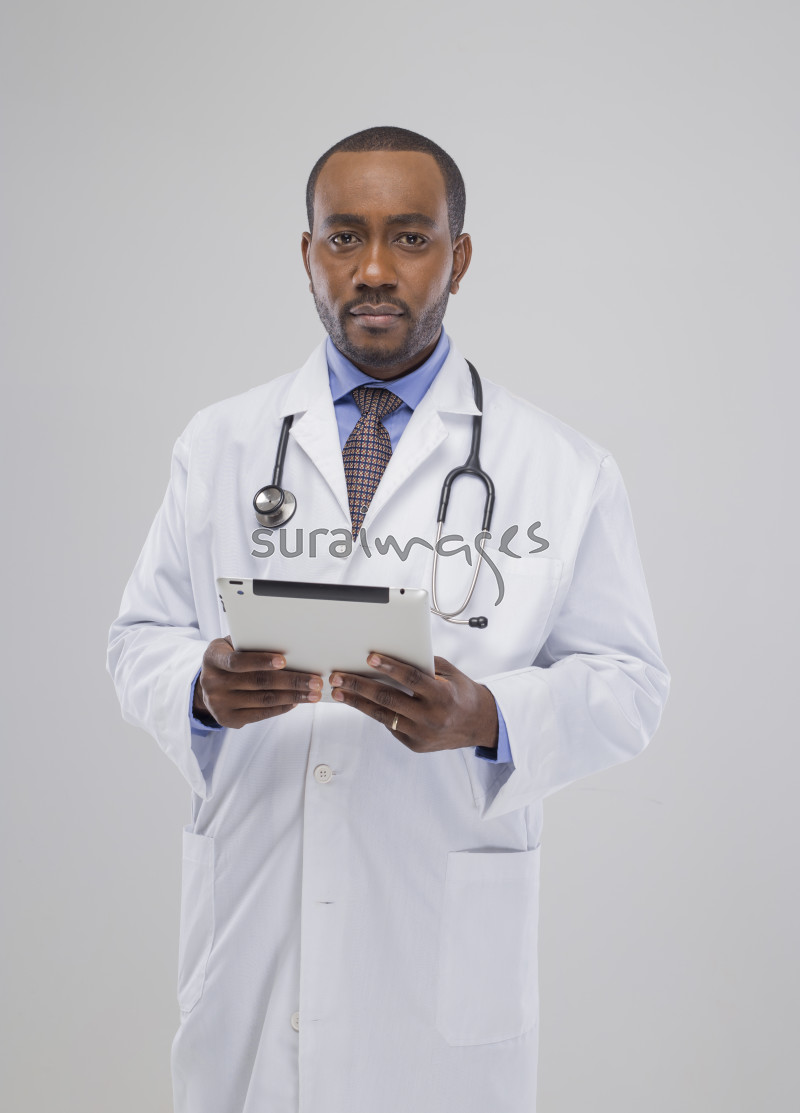 | Title | A happy male doctor standing on isolated white background while holding a tablet |