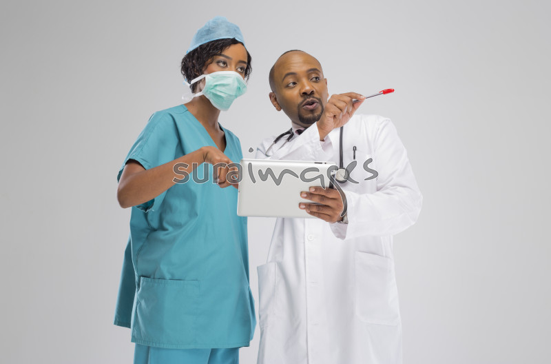 | Title | A female surgeon and a male general doctor looking at patient records from a tablet |