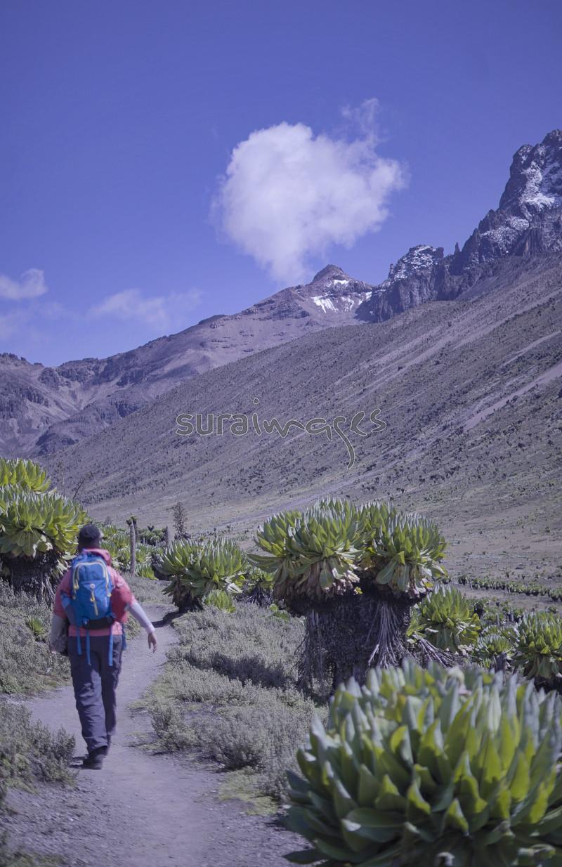 Title A mountain climber walking towards mount Kenya