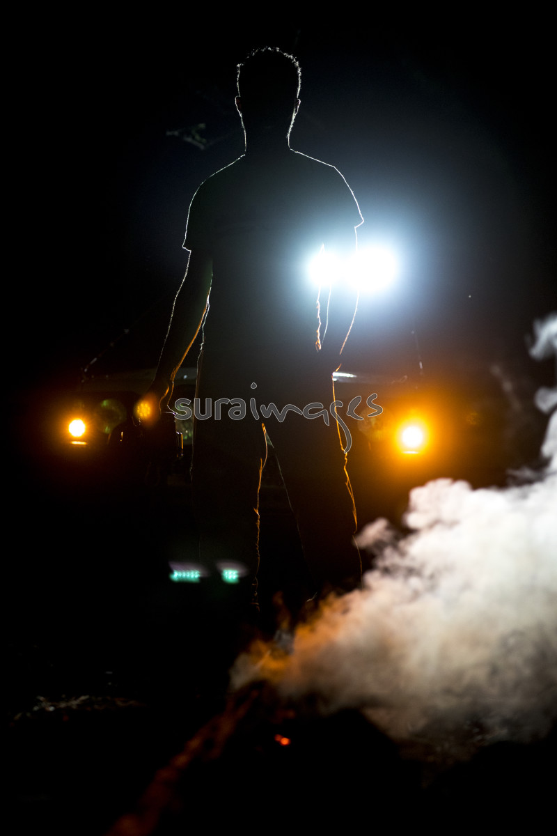 Title A silhouette of a young man standing in front of car headlights