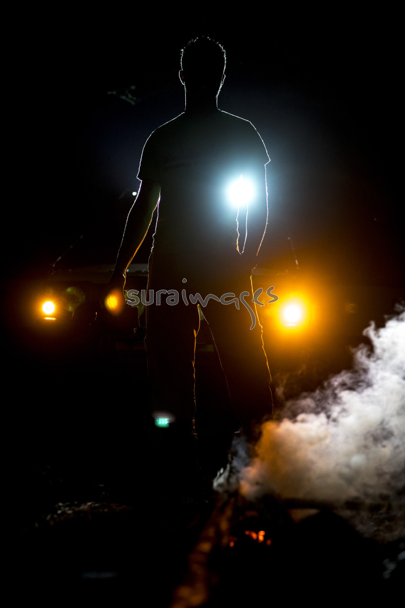 Title A silhouette of a young man standing in front of car headlights