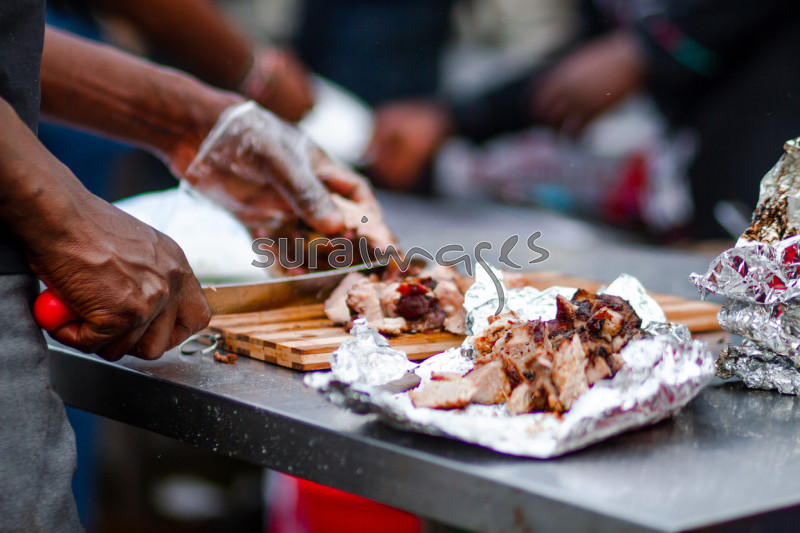 A chef cutting nyama choma from the chopping board