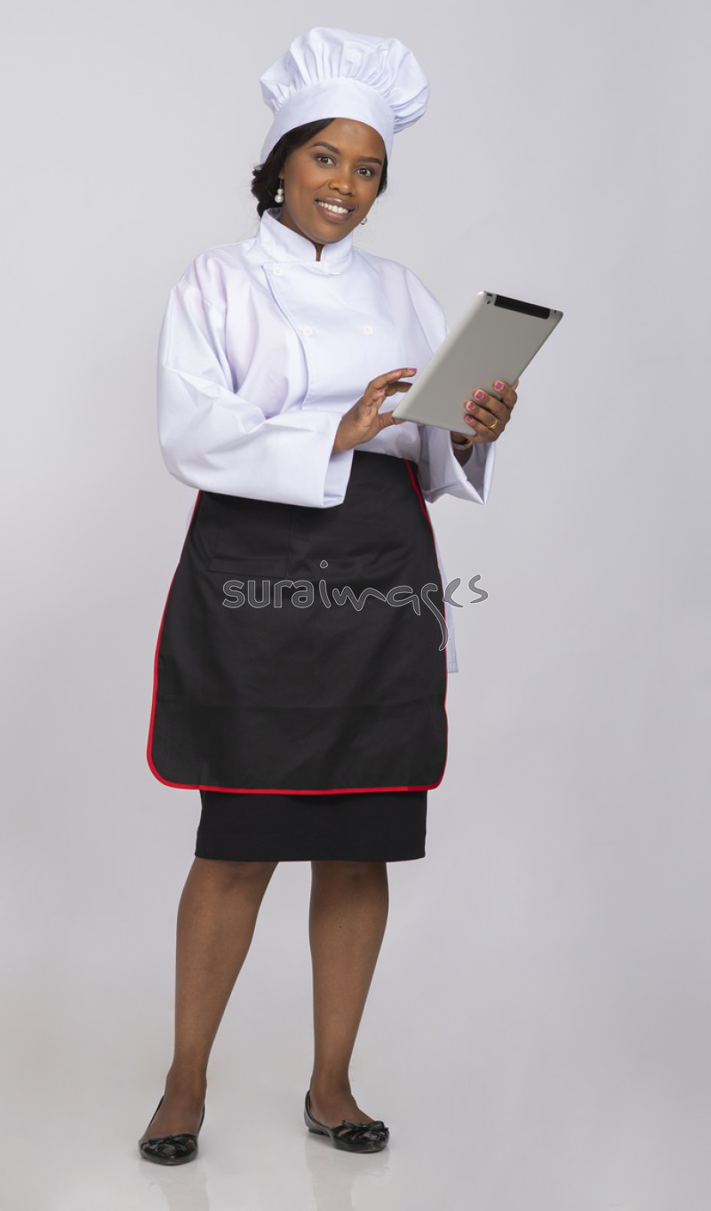 Title Female cheff following a recipe from her tablet