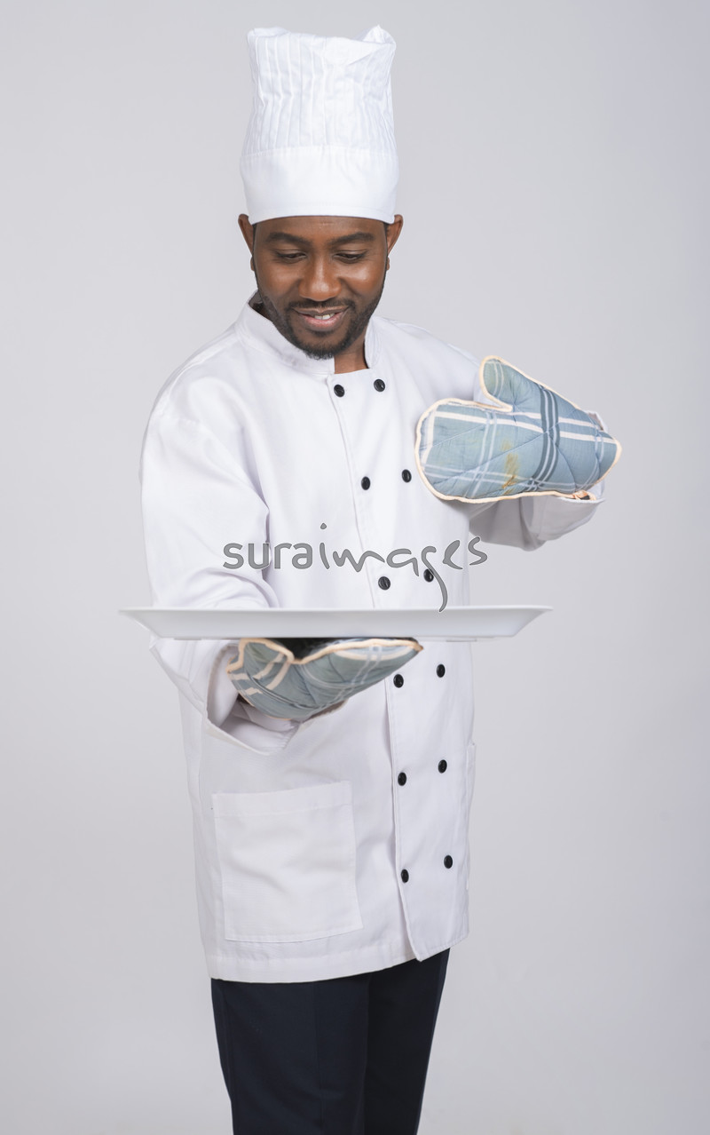 Title Male chef holding a tray