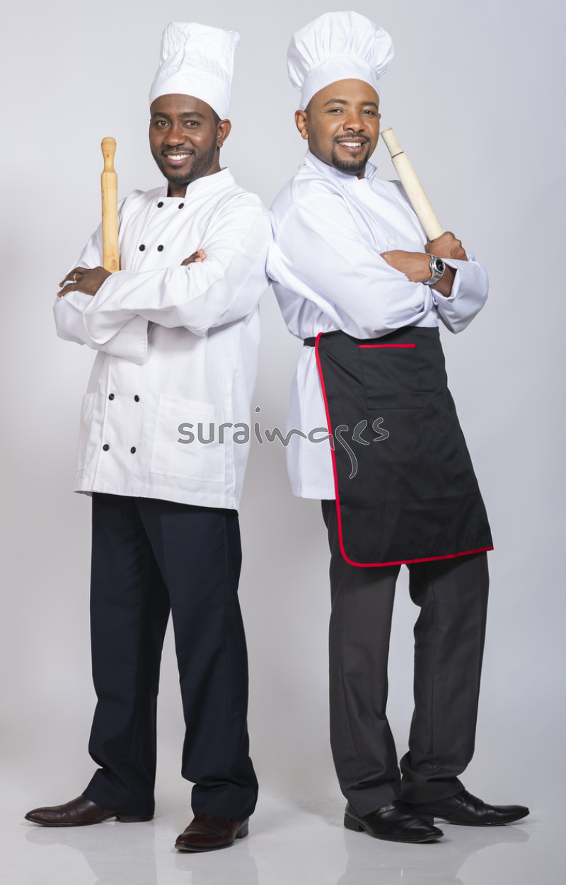 Two happy male chefs goofing around