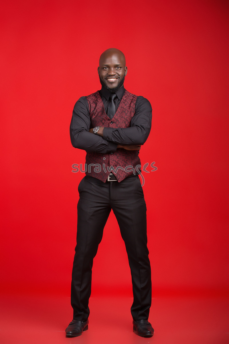 | Title | Young male business executive on red isolated background |