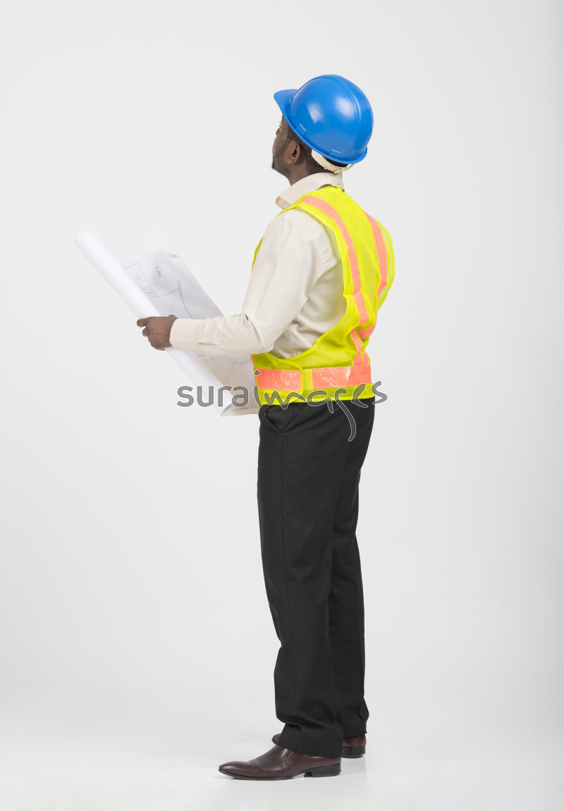 Title Young male engineer reading the building blueprint