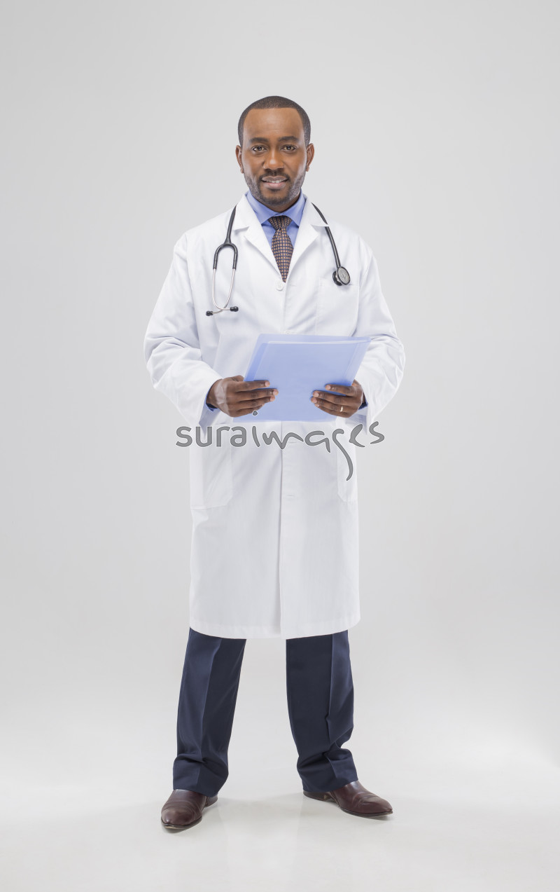 | Title | Male doctor standing on isolated white background while holding patient file |
